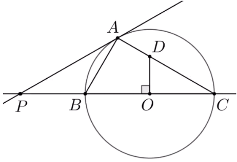 Cho tam giác $ABC(AB < AC)$ nội tiếp trong đường tròn tâm $O$ đường kính $BC$. Đường thẳng qua $O$ vuông góc với $BC$cắt $AC$ tại $D$.