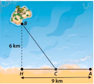 Một công ty muốn làm một đường ống dẫn từ vị trí $A$ trên bờ biển đến vị trí $B$ trên hòn đảo. Khoảng cách từ điểm $B$ đến bờ biển là $BH = 6~\text{km}$. Giá tiền để xây dựng đường ống trên bờ là $50000\text{USD}/\text{km}$ và giá tiền để xây dựng đường ống trên biển là $130000\text{USD}/\text{km}$, biết $AH = 9~\text{km}$. Xác định vị trí điểm $C$ trên đoạn $AH$ để khi lắp ống dẫn theo đường gấp khúc $ACB$ thì chi phí công ty bỏ ra là thấp nhất.