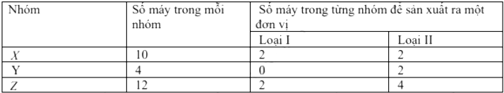 Có ba nhóm máy X, Y, Z dùng để sản xuất ra hai loại sản phẩm I và II. Để sản xuất một đơn vị sản phẩm mỗi loại lần lượt phải dùng các máy thuộc các nhóm khác nhau. Số máy trong một nhóm và số máy của từng nhóm cần thiết để sản xuất ra một đơn vị sản phẩm thuộc mỗi loại được dùng cho trong bảng sau: