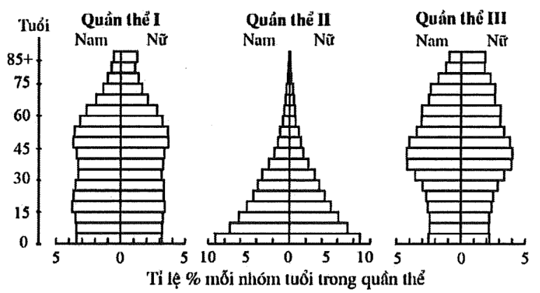 Chú ý: độ tuổi sinh sản ở người là khoảng từ 18 – 35. Quần thể có nhóm tuổi này chiếm nhiều % sẽ có tỷ lệ sinh sản cao hơn.