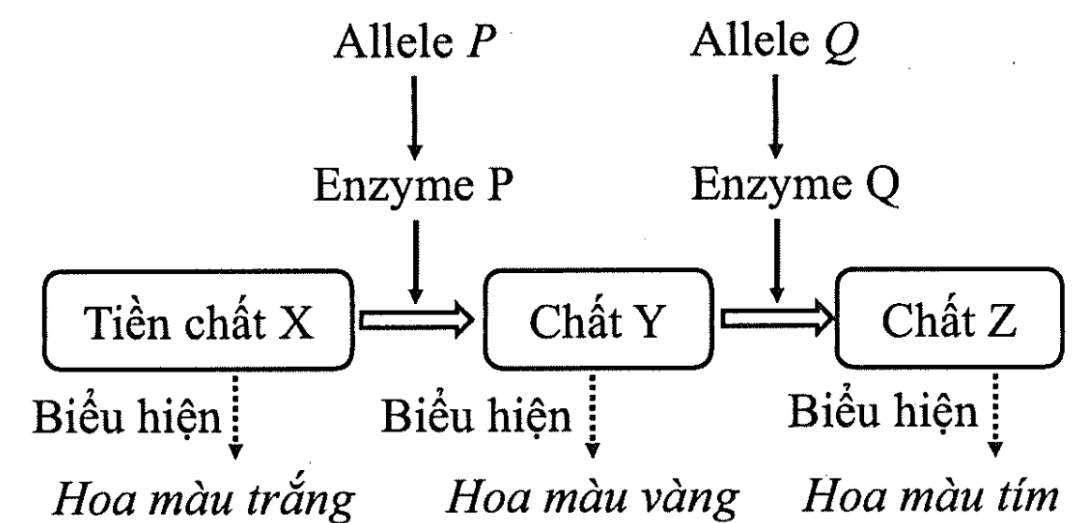 Ở một loài thực vật, màu hoa do 2 cặp gene nằm trên 2 cặp NST thường khác nhau quy định. Mỗi gene gồm 2 allele có kiểu quan hệ trội lặn hoàn toàn. Sơ đồ bên thể hiện chuỗi chuyển hóa hình thành màu hoa ở loài này; trong đó, các allele trội (P, Q) mã hóa các enzyme xúc tác phản ứng tạo màu hoa, các allele lặn không mã hóa enzyme có hoạt tính. Người ta cho các cây hoa màu trắng thuần chủng lai với cây hoa màu vàng thuần chủng, thu được F1 100% cây hoa màu tím. Sau đó, các cây F1 tự thụ phấn thu được các cây F2. Biết rằng, không có đột biến phát sinh. Theo lí thuyết, tỉ lệ cây hoa màu vàng ở F2 là bao nhiêu (làm tròn kết quả cuối cùng đến hàng phần trăm)?