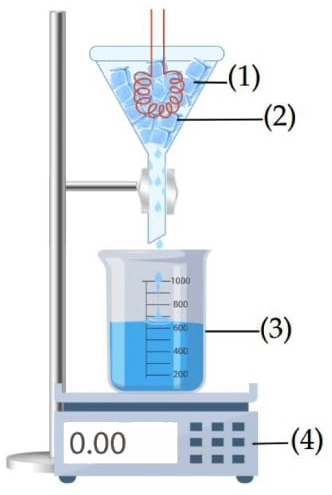 Một nhóm học sinh thảo luận phương án thí nghiệm làm giảm ảnh hưởng của sự trao đổi nhiệt với môi trường khi đo nhiệt nóng chảy riêng của nước đá. Họ dùng các dụng cụ: Phễu chứa nước đá (1), dây điện trở (2), cốc (3), cân điện tử (4) như hình bên.