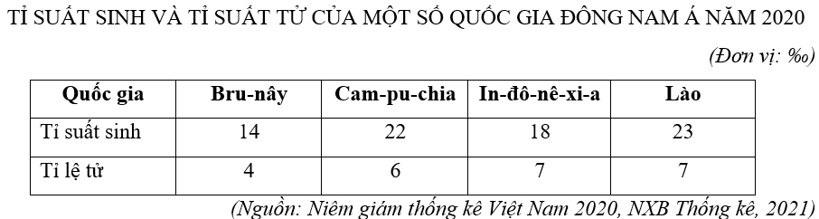 Cho bảng số liệu: Theo bảng số liệu, cho biết quốc gia nào sau đây có tỉ lệ