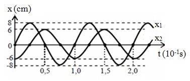 Cho hai dao động điều hoà với li độ x1 và x2 có đồ thị như hình vẽ. Tổng tốc độ của hai dao động ở cùng một thời điểm có giá trị lớn nhất là
