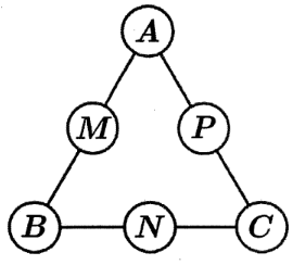 Bạn Nam tham gia cuộc thi giải một mật thư. Theo quy tắc của cuộc thi, người chơi cần chon ra sáu số từ tập $S = \left\{ {41;42;43;44;45;46;47;48;49} \right\}$ và xếp mỗi số vào đúng một vị trí trong sáu vị trí $A,B,C,M,N,P$ như hình bên sao cho mỗi vị trí chi được xếp một số. Mật thư sẽ được giải nếu các bộ ba số xuất hiện ở những bộ ba vị trí $\left( {A,M,B} \right);\left( {B,N,C} \right);\left( {C,P,A} \right)$ tạo thành các cấp số cộng theo thứ tự đó. Bạn Nam chọn ngẫu nhiên sáu số trong tập $S$ và xếp ngẫu nhiên vào các vị trí được yêu cầu. Gọi xác suất để bạn Nam giải được mật thư ở lần chọn và xếp đó là $a$. Giá trị của $\dfrac{4}{a}$ bằng bao nhiêu?