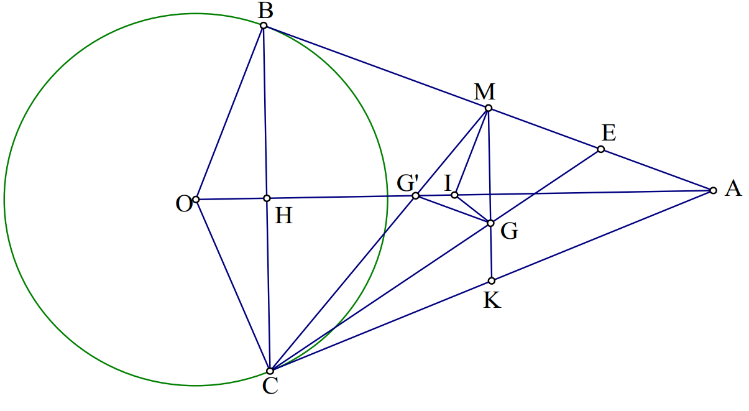 Cho đường tròn $(O;5~\text{cm})$ và điểm A ở ngoài đường tròn. Dựng hai tiếp tuyến $AB,{\mkern 1mu} AC$ với đường tròn $(O)$($B,{\mkern 1mu} C$ là các tiếp điểm). Gọi $M,{\mkern 1mu} I$ lần lượt là trung điểm của AB và OA. Gọi G là trọng tâm của tam giác $ACM,G'$ là giao điểm của CM và OA. Khi tam giác $IGG'$ cân tại I, tìm độ dài BC (làm tròn kết quả đến chữ số thập phân thứ hai)