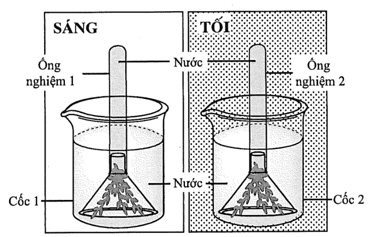 Đặt cốc 1 ở ngoài sáng và cốc 2 ở trong tối, với điều kiện nhiệt độ phòng (25°C - 30°C); quan sát bọt khí, sự thay đổi mực nước ở 2 ống nghiệm. Sau 60 phút, ống nghiệm được lấy ra khỏi phễu (đảm bảo nước và khí không bị thoát ra khỏi ống nghiệm) để kiểm tra thành phần bọt khí bằng cách đưa vào miệng mỗi ống nghiệm một que diêm còn tàn lửa và quan sát.