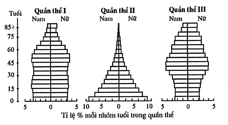 Hình bên thể hiện các tháp tuổi của ba quần thể người năm 2010.