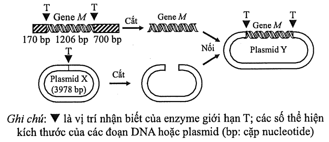 Công nghệ DNA tái tổ hợp đã có nhiều thành tựu đột phá, như tạo sinh vật biến đổi gene. Hình bên thể hiện các bước tạo DNA tái tổ hợp; trong đó, gene M của một loài nấm sợi được nối với vector plasmid X để tạo thành plasmid Y.