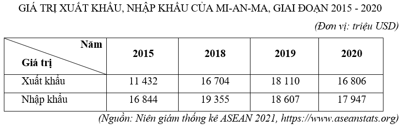 Cho bảng số liệu: Theo bảng số liệu, cho biết Mi-an-ma nhập siêu lớn nhất vào năm nào sau