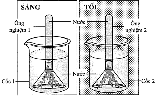 Để thực hiện thí nghiệm về quá trình quang hợp ở thực vật cần chuẩn bị như sau: cành rong đuôi chó, nước, ống nghiệm, phễu thủy tinh, cốc thủy tỉnh, diêm. Học sinh đã tiến hànhthí nghiệm được mô tả ở hình bên: đặt cốc 1 ở ngoài sáng và cốc 2 ở trong tối, với điều kiện nhiệt độ phòng (25°C - 30°C); quan sát bọt khí, sự thay đổi mực nước ở 2 ống nghiệm.