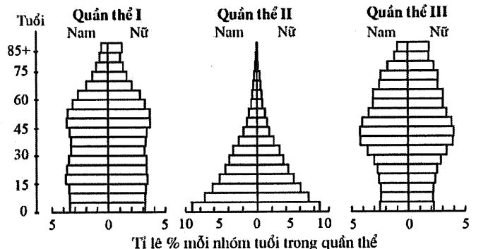 Hình bên thể hiện các tháp tuổi của ba quần thể người năm 2010.