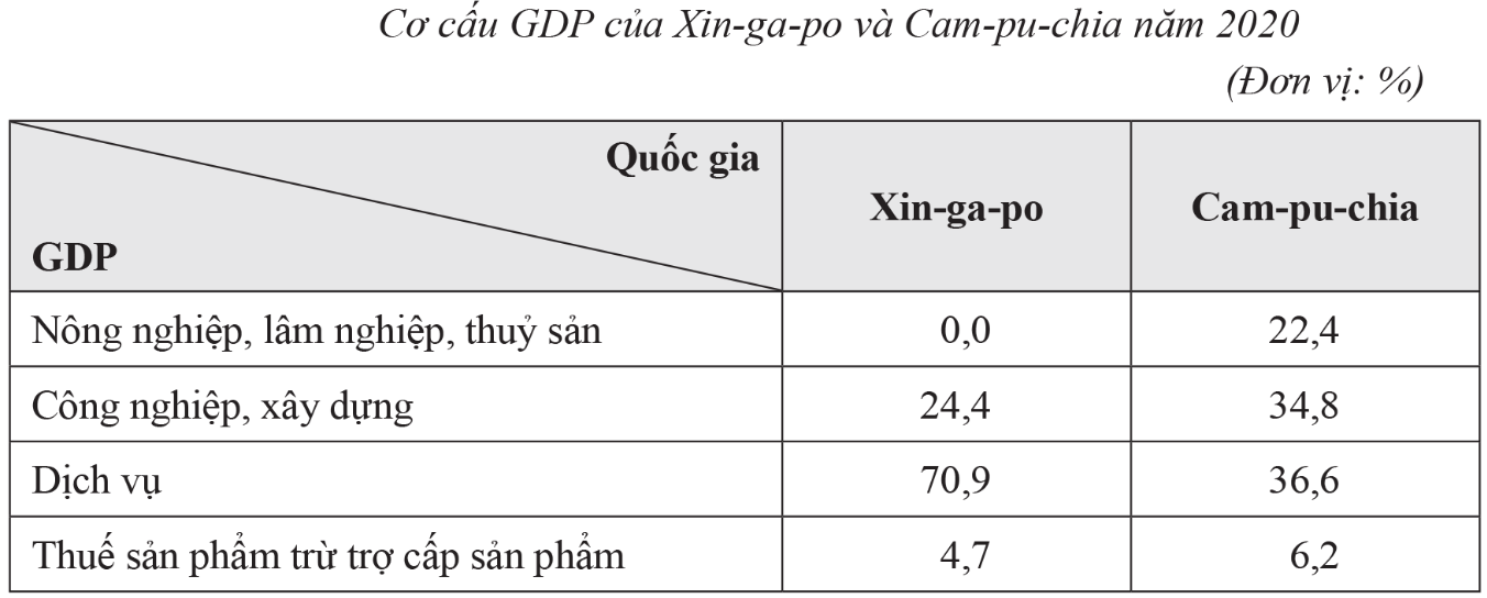 Dựa vào bảng số liệu và nhận xét sự khác biệt trong cơ cấu GDP của Xin-ga-po và Cam-pu-chia (chủ yếu trong ngành nông nghiệp, lâm nghiệp, thủy sản và dịch vụ). Vận dụng kiến thức bản thân và giải thích sự khác biệt đó.