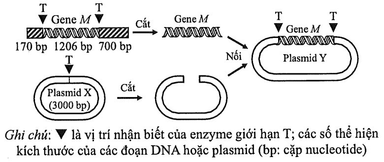 Công nghệ DNA tái tổ hợp đã có nhiều thành tựu đột phá, như tạo sinh vật biến đổi gene. Hình bên thể hiện các bước tạo DNA tái tổ hợp; trong đó, gene Mcủa một loài nấm sợi được nối với vector plasmid X để tạo thành plasmid Y. Biết rằng, các thí nghiệm được thực hiện trong điều kiện tối ưu, không có đột biến phát sinh.