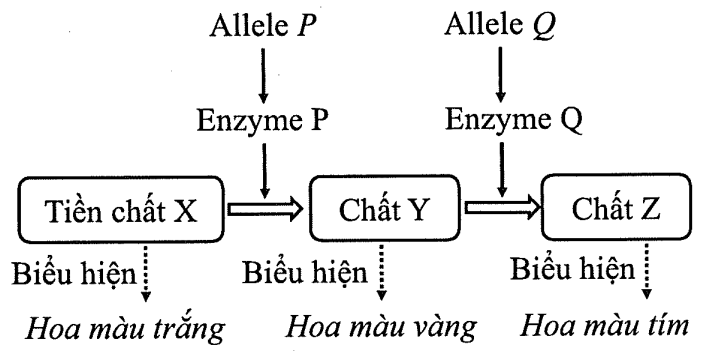 Ở một loài thực vật, màu hoa do 2 cặp gene năm trên 2 cặp NST thường khác nhau quy định. Mỗi gene gồm 2 allele có kiểu quan hệ trội lặn hoàn toàn. Sơ đồ bên thể hiện chuỗi chuyển hóa hình thành màu hoa ở loài này; trong đó, các allele trội (P, Q) mã hóa các enzyme xúc tác phản ứng tạo màu hoa, các allele lặn khộng mã hóa enzyme có hoạt tính.