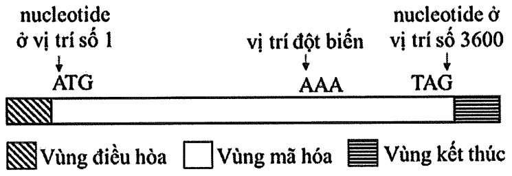 Một gene ở sinh vật nhân sơ có cấu trúc được thể hiện ở hình bên; trong đó, ATG và TAG lần lượt là mã mở đầu và mã kết thúc của gene. Một đột biến thay thế cặp nucleotide làm biến đổi bộ ba AAA thành TAA, dẫn đến xuất hiện mã kết thúc sớm và làm số lượng amino acid của chuỗi polypeptide hoàn chỉnh bị giảm 313 amino acid.