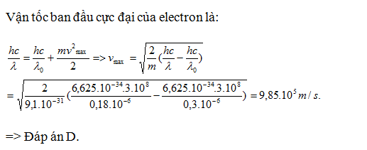 Chiếu bức xạ có bước sóng 0,18 μm vào một tấm kim loại có giới hạn quang điện là 0,30 μm. Vận tốc ban đầu cực đại của quang êlectron là