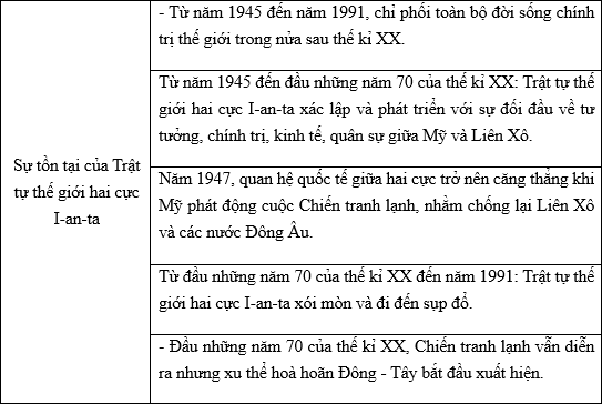 | a) Sự tồn tại của Trật tự hai cực I-an-ta gắn liền với những diễn biến của cuộc Chiến tranh lạnh giữa hai cực Liên Xô và Mỹ. | ||