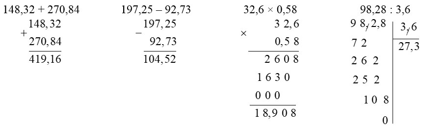 a) Đặt tính rồi thực hiện các phép tính cộng, trừ, nhân, chia số thập phân
