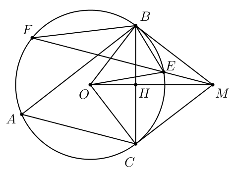 Cho tam giác ABC nhọn (AB > AC), nội tiếp đường tròn (O; R). Các tiếp tuyến tại B và C cắt nhau tại M. Gọi H là giao điểm của OM và BC. Từ M kẻ đường thẳng song song với AC, đường thẳng này cắt (O) tại E và F (E thuộc cung nhỏ BC). Chứng minh$MO\bot BC$ và $ME \cdot MF = MH \cdot MO$
