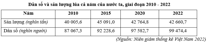 Dựa vào bảng số liệu, hãy cho biết bình quân sản lượng lúa theo đầu người của nước ta năm 2022 là bao nhiêu kg/người? (làm tròn kết quả đến hàng đơn vị).