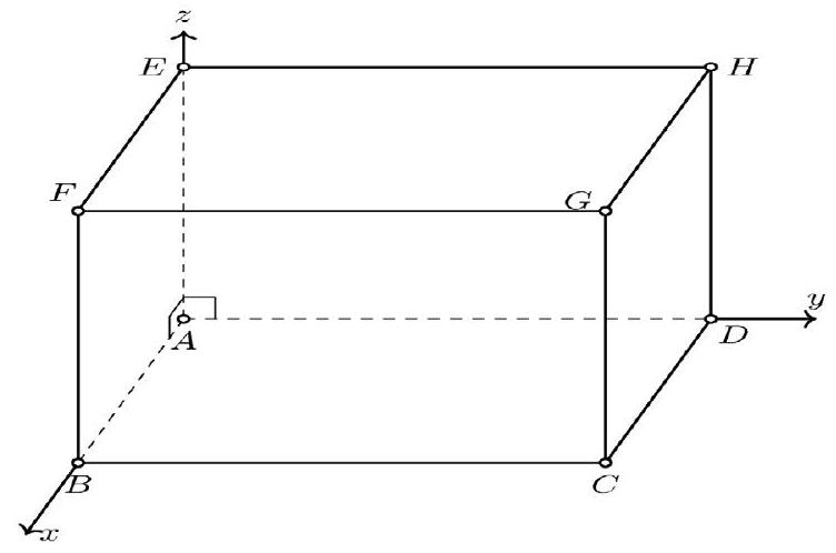 Cho hình hộp $ABCD.EFGH$ có $AB = 6,AD = 7,AE = 5$. Xét hệ trục tọa độ $Oxyz$ có gốc $O$ trùng với