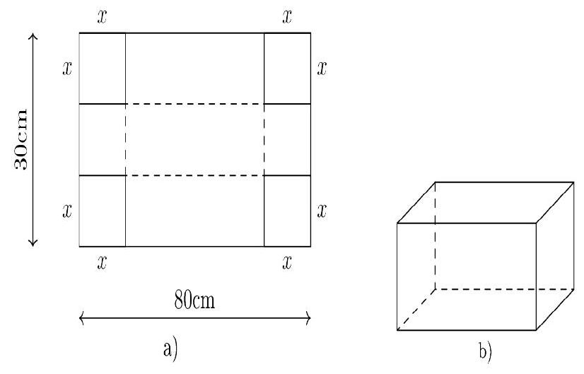 Từ một tấm bìa hình chữ nhật có chiều rộng 30 cm và chiều dài 80 cm như hình $a$, người ta cắt ở bốn góc bốn hình vuông có cạnh $x$ với $5 \leq x \leq 8$ và gấp lại để tạo thành chiếc hộp có dạng hình hộp chữ nhật không nắp như hình $b$. Tìm $x$ để thể tích chiếc hộp là lớn nhất (với kết quả được làm tròn đến hàng phần chục).