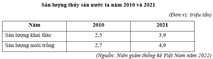 Căn cứ vào bảng số liệu trên, tính chênh lệch tổng sản lượng thủy sản năm 2021 so với năm 2010 (làm tròn đến chữ số thập phân thứ nhất).