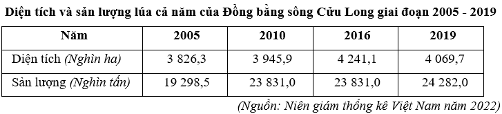 Cho bảng số liệu:Năng suất lúa của Đồng bằng sông Cửu Long năm 2019 là bao nhiêu tạ/ha? (làm