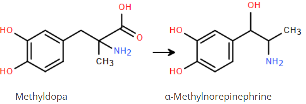 Thuốc Methyldopa là một loại thuốc hạ huyết áp. Sau khi uống, Methyldopa được chuyển hóa ở gan và thần kinh trung ương để tạo thành α-Methylnorepinephrine có tác dụng hạ huyết áp.