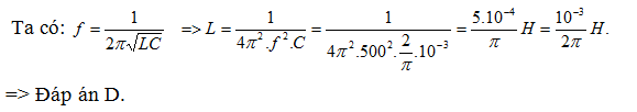Một mạch dao động có tụ điện C = 2.10-3 / πF và cuộn dây thuần cảm L. Để tần số điện từ trong mạch bằng 500 Hz thì L phải có giá trị