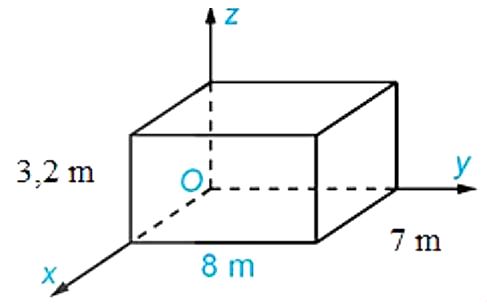 Một phòng học có thiết kế dạng hình hộp chữ nhật với chiều dài là $8m$, chiều rộng là $7m$ và chiều cao là 3,2m. Tại vị trí chính giữa trần nhà của phòng học được gắn một chiếc quạt trần. Xét hệ trục toạ độ $Oxyz$ có gốc $O$ trùng với một góc phòng và mặt phẳng $\left( {Oxy} \right)$ trùng với mặt sàn (hình vẽ), đơn vị đo được lấy theo mét. Tìm toạ độ của điểm gắn quạt.