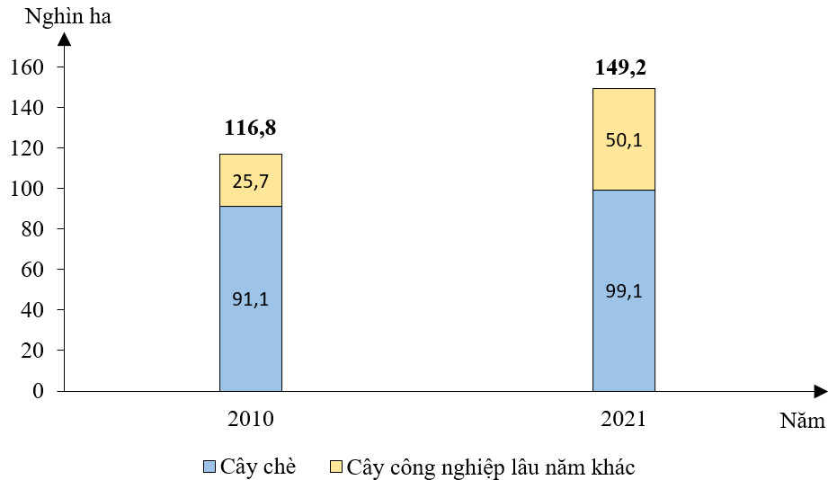 a) Hãy vẽ biểu đồ thể hiện diện tích cây công nghiệp, trong đó có cây chè của vùng Trung du và miền núi Bắc Bộ năm 2010 và năm 2021.