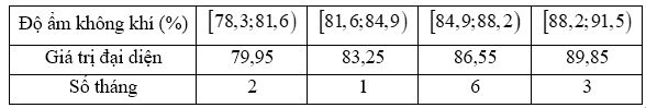 Thống kê độ ẩm không khí trung bình các tháng trong năm 2021 tại Đà Lạt (đơn vị: %) thu được mẫu số liệu ghép nhóm sau: