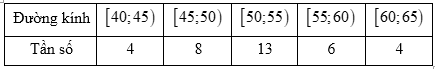 Một nhân viên thống kê lại đường kính thân gỗ của một số cây xoan đào 10 năm tuổi được trồng ở lâm trường Bến En theo bảng sau.