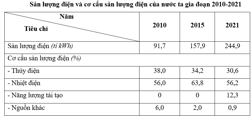| c) Thủy điện đóng vai trò quan trọng và chủ yếu nhất trong cơ cấu sản lượng điện. | ||