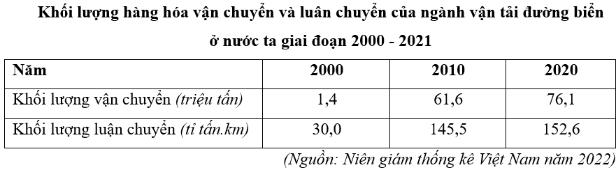 Cho bảng số liệu:Căn cứ vào bảng số liệu trên, cho biết năm 2020 cự li vận chuyển trung bình