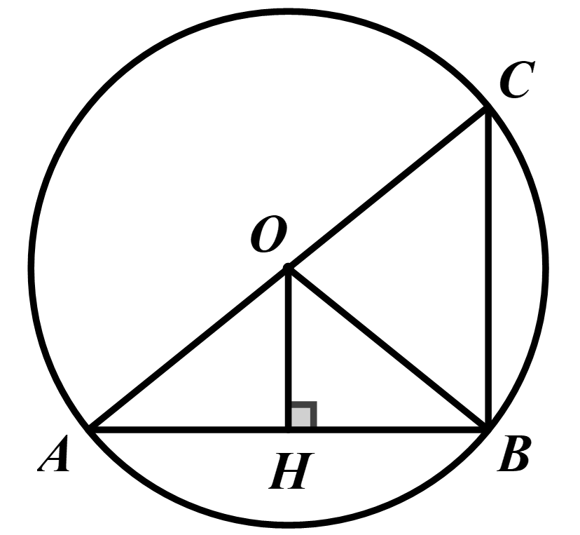 | b) Từ $O$ kẻ $OH$ vuông góc với $AB$ tại $H$. Khi đó $H$ là trung điểm của $AB$. | ||