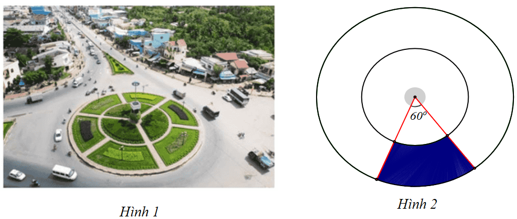 Tại một vòng xoay ngã tư, người ta cần làm các bồn trồng hoa như hình 1. Em hãy tính phần
