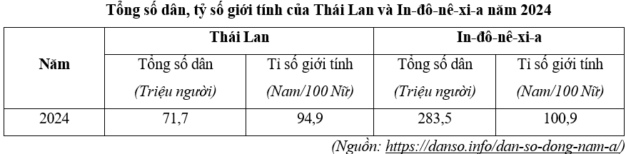 | d) Năm 2024, số nam của In-đô-nê-xi-a cao hơn 15,3 triệu người so với số nam của Thái Lan. |