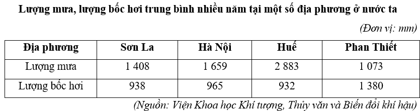 Cho bảng số liệu:Căn cứ vào bảng số liệu trên, hãy cho biết địa phương có cân bằng ẩm