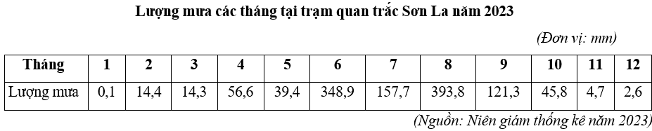 Căn cứ vào bảng số liệu, hãy tính tổng lượng mưa các tháng mùa khô ở Sơn La năm 2023. (Làm tròn kết quả đến hàng đơn vị của mm)