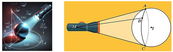 Nguồn sáng phát ra từ một cây đèn pin khi chiếu vào một quả cầu phản quang sẽ cho ta hình ảnh của một mặt cầu tiếp xúc với các đường sinh của một hình nón (xem hình vẽ). giả sử nguồn sáng phát ra từ điểm M, trong một hệ trục tọa độ Oxyz cho sẵn với đơn vị trên mỗi trục là mét, các tiếp tuyến MA, MB, MC thoả mãn $AMB = 60^{{^\circ}},BMC = 90^{{^\circ}},CMA = 120^{{^\circ}}$. Mặt cầu $(S)$ có phương trình $x^{2} + y^{2} + z^{2} - 2x - 4y + 6z - 13 = 0$