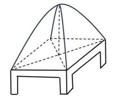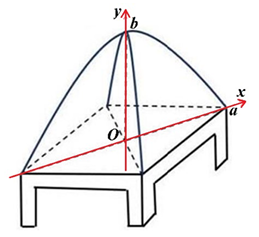 Mặt cắt ngang cái màn chụp theo mặt phẳng song song với mặt giường luôn luôn là một hình chữ nhật nên ta gắn hệ trục toạ độ với O là tâm bàn, hai trục Ox, Oy là hai đường chéo và đường thẳng nối từ đỉnh màn tới O.