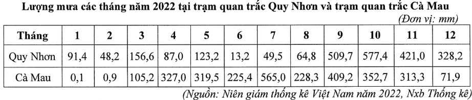 Cho bảng số liệu:Nhận xét nào sau đây đúng về lượng mưa tại Quy Nhơn và Cà