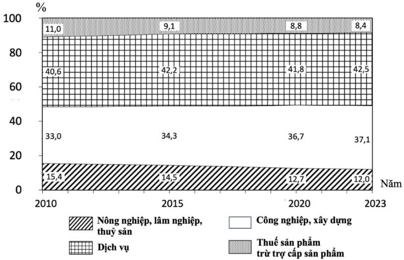 Biểu đồ cơ cấu GDP của nước ta phân theo khu vực kinh tế giai đoạn 2010 - 2023