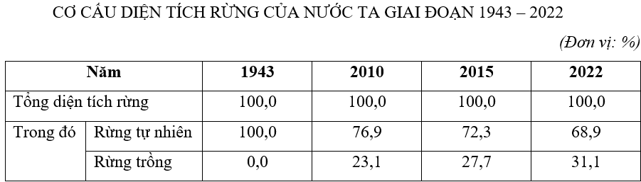 Dựa vào bảng số liệu trên, hãy nhận xét và giải thích sự thay đổi cơ cấu diện tích rừng của nước ta giai đoạn 1943 – 2022.