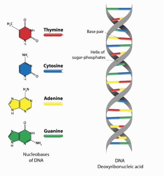 DNA được cấu tạo được cấu tạo theo nguyên tắc đa phân, đơn phân là các nucleotide gồm 4 loại là A, T, G, C.