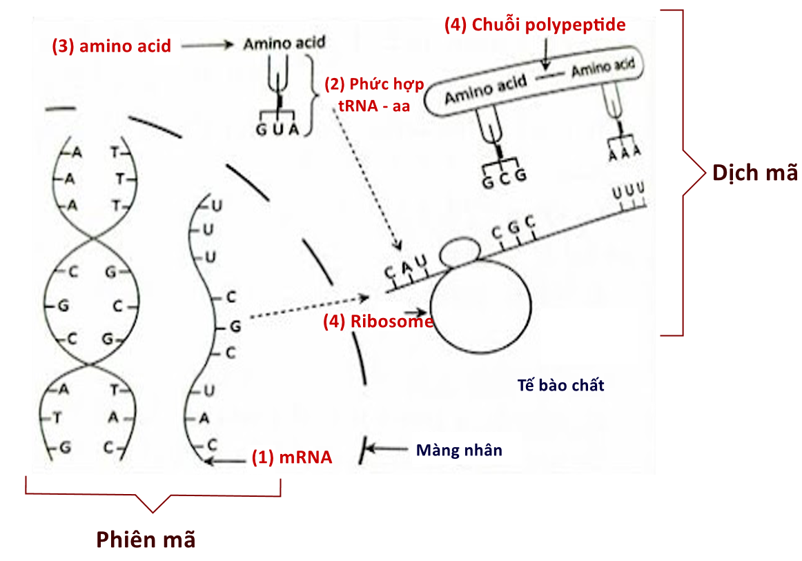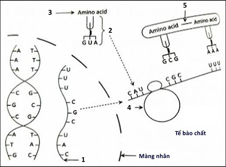 | c) Số (4) và số (5) lần lượt là ribosome và chuối polypepetide. | ||
