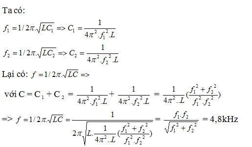 Khi mắc tụ điện có điện dung C1 với cuộn cảm L thì tần số dao động của mạch là f1 = 6kHz; khi mắc tụ điện có điện dung C2 với cuộn L thì tần số dao động của mạch là f2 = 8kHz. Khi mắc C1 song song C2 với cuộn L thì tần số dao động của mạch là bao nhiêu?